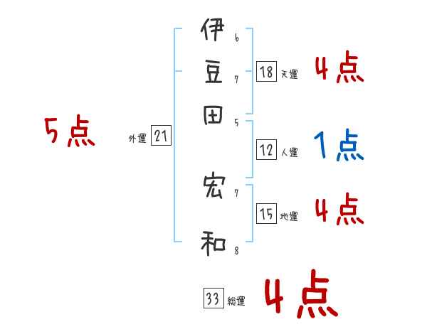 外運![]() | 伊豆田宏和さんの外運は21画の5つ星!統率力がある。独立し成功する。名誉を手に入れる。 生活面を象徴する運勢です。外部から受ける影響力を表し、結婚運、家庭運や職場、環境への順応性を表します。 |