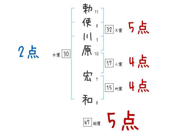 天運![]() | 勅使川原宏和さんの天運は32画の5つ星!柔軟性があり成功する。チャンスが多く金運が良い。 家系が持つ宿命的な運勢を表します。祖先から受け継いだ苗字ですので自分の力が及びません。家柄を象徴します。 |