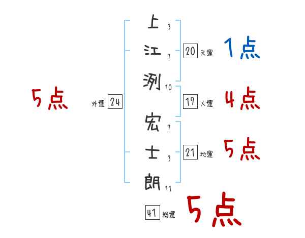 外運![]() | 上江洌宏士朗さんの外運は24画の5つ星!家庭運が良く順調な人生。金運にも恵まれる。 生活面を象徴する運勢です。外部から受ける影響力を表し、結婚運、家庭運や職場、環境への順応性を表します。 |