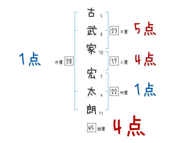 天運![]() | 古武家宏太朗さんの天運は23画の5つ星!想像力に優れ活力がある。一代で成功し名誉を手に入れる。 家系が持つ宿命的な運勢を表します。祖先から受け継いだ苗字ですので自分の力が及びません。家柄を象徴します。 |