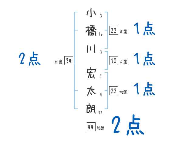 総運![]() | 小橋川宏太朗さんの総運は44画の2つ星!誠実で慎重な性格。物事を考えすぎないように注意しましょう。 あなたの人生を表す1番重要な運勢です。生涯を通じて影響する総合運となり、主に50歳以降の晩年期に影響を及ぼします。 |