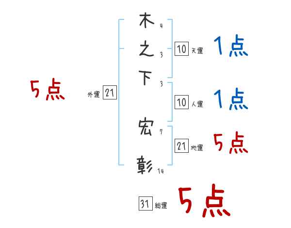 天運![]() | 木之下宏彰さんの天運は10画の1つ星!不安を感じやすい傾向。ストレスを抱えないように注意しましょう。 家系が持つ宿命的な運勢を表します。祖先から受け継いだ苗字ですので自分の力が及びません。家柄を象徴します。 |