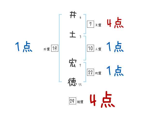 天運![]() | 井土宏徳さんの天運は7画の4つ星!強い意志や信念を持ち独立心が強い。自立する。 家系が持つ宿命的な運勢を表します。祖先から受け継いだ苗字ですので自分の力が及びません。家柄を象徴します。 |