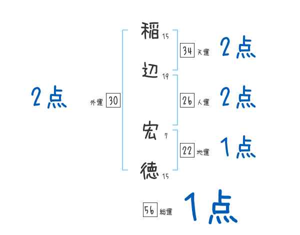 総運![]() | 稲辺宏徳さんの総運は56画の1つ星!消極的で無気力になりがち。誠実な気持ちが必要でしょう。 あなたの人生を表す1番重要な運勢です。生涯を通じて影響する総合運となり、主に50歳以降の晩年期に影響を及ぼします。 |