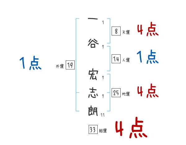 天運![]() | 一谷宏志朗さんの天運は8画の4つ星!勤勉家。根気強く努力し成功する。忍耐力がある。 家系が持つ宿命的な運勢を表します。祖先から受け継いだ苗字ですので自分の力が及びません。家柄を象徴します。 |