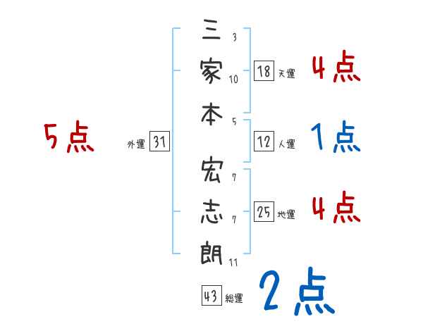 総運![]() | 三家本宏志朗さんの総運は43画の2つ星!頑固な性格で独立心が強いかも。やや非現実的で浪費に注意しましょう。 あなたの人生を表す1番重要な運勢です。生涯を通じて影響する総合運となり、主に50歳以降の晩年期に影響を及ぼします。 |
