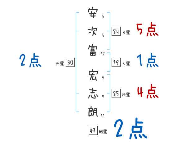 天運![]() | 安次富宏志朗さんの天運は24画の5つ星!家庭運が良く順調な人生。金運にも恵まれる。 家系が持つ宿命的な運勢を表します。祖先から受け継いだ苗字ですので自分の力が及びません。家柄を象徴します。 |