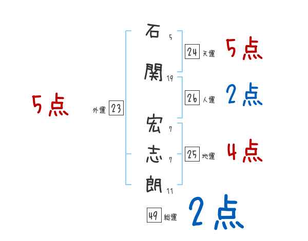 天運![]() | 石関宏志朗さんの天運は24画の5つ星!家庭運が良く順調な人生。金運にも恵まれる。 家系が持つ宿命的な運勢を表します。祖先から受け継いだ苗字ですので自分の力が及びません。家柄を象徴します。 |