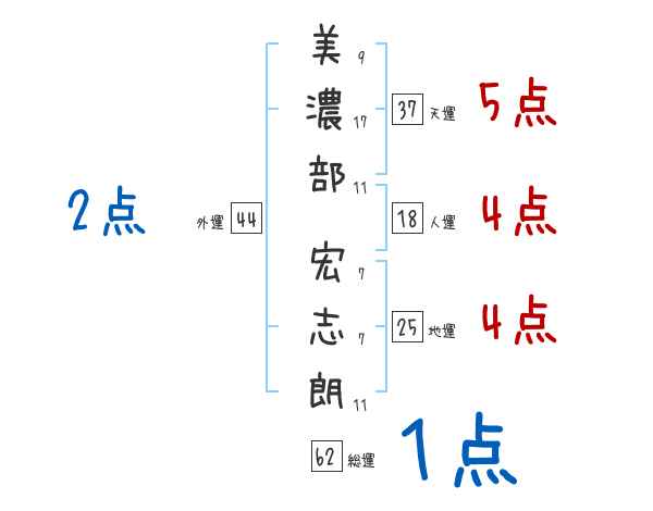 外運![]() | 美濃部宏志朗さんの外運は44画の2つ星!誠実で慎重な性格。物事を考えすぎないように注意しましょう。 生活面を象徴する運勢です。外部から受ける影響力を表し、結婚運、家庭運や職場、環境への順応性を表します。 |