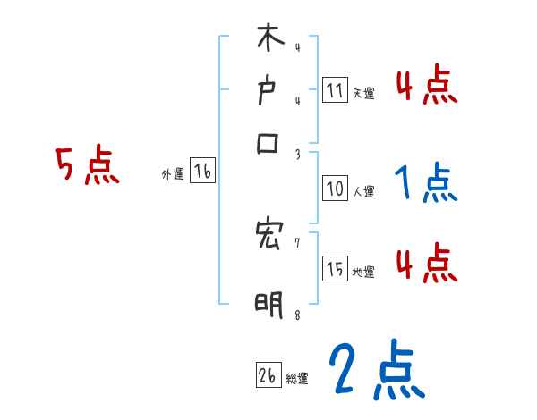 外運![]() | 木戸口宏明さんの外運は16画の5つ星!人望が厚く大きく発展する。逆転成功が見える。 生活面を象徴する運勢です。外部から受ける影響力を表し、結婚運、家庭運や職場、環境への順応性を表します。 |