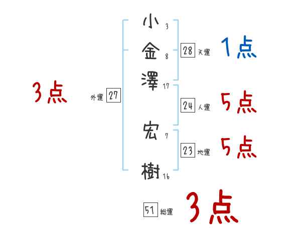総運![]() | 小金澤宏樹さんの総運は51画の3つ星!変化が激しく、危険に注意。堅実な性格。 あなたの人生を表す1番重要な運勢です。生涯を通じて影響する総合運となり、主に50歳以降の晩年期に影響を及ぼします。 |