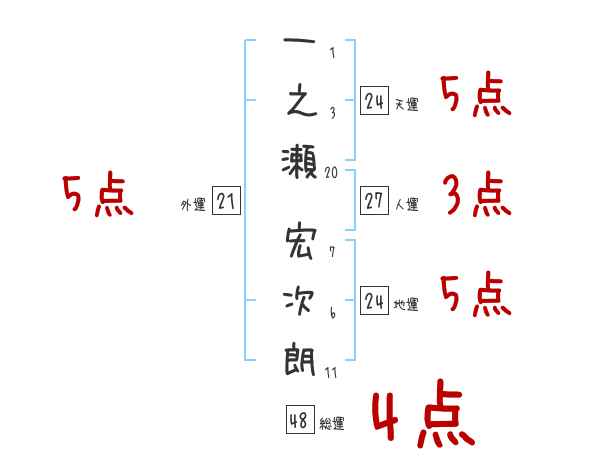 外運![]() | 一之瀬宏次朗さんの外運は21画の5つ星!統率力がある。独立し成功する。名誉を手に入れる。 生活面を象徴する運勢です。外部から受ける影響力を表し、結婚運、家庭運や職場、環境への順応性を表します。 |