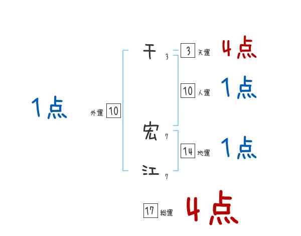 天運![]() | 千宏江さんの天運は3画の4つ星!活動的で才能に恵まれ、多くの信頼を得る。希望に満ち成長する。 家系が持つ宿命的な運勢を表します。祖先から受け継いだ苗字ですので自分の力が及びません。家柄を象徴します。 |