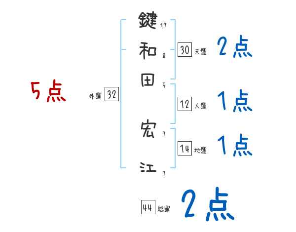 外運![]() | 鍵和田宏江さんの外運は32画の5つ星!柔軟性があり成功する。チャンスが多く金運が良い。 生活面を象徴する運勢です。外部から受ける影響力を表し、結婚運、家庭運や職場、環境への順応性を表します。 |