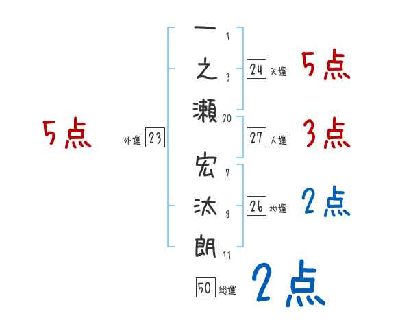 外運![]() | 一之瀬宏汰朗さんの外運は23画の5つ星!想像力に優れ活力がある。一代で成功し名誉を手に入れる。 生活面を象徴する運勢です。外部から受ける影響力を表し、結婚運、家庭運や職場、環境への順応性を表します。 |