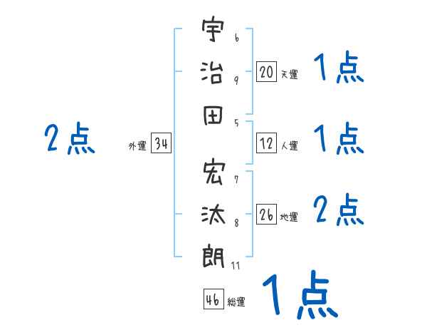 地運![]() | 宇治田宏汰朗さんの地運は26画の2つ星!波瀾万丈かも。信頼できる人を大事にしましょう。 個性を表す基礎的な運勢です。性格形成や対人関係、行動力など家庭環境に影響されます。主に誕生してから20歳くらいまでの若年期の運勢を表します。 |