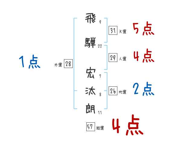 天運![]() | 飛騨宏汰朗さんの天運は31画の5つ星!社交性があり判断力に優れる。順風満帆な人生で円満な生活。 家系が持つ宿命的な運勢を表します。祖先から受け継いだ苗字ですので自分の力が及びません。家柄を象徴します。 |