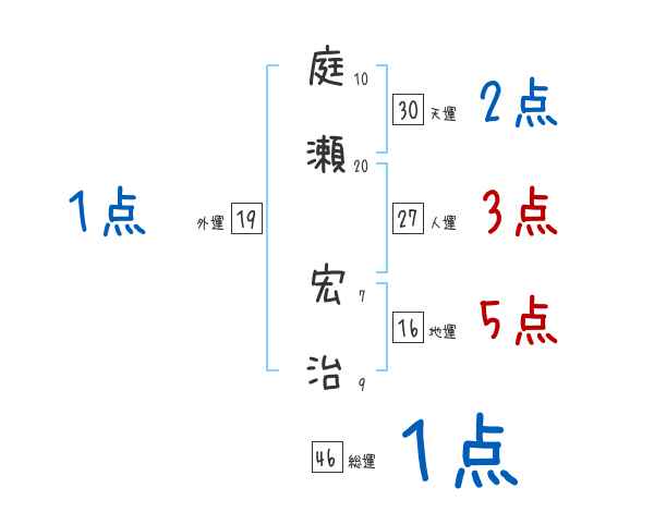 天運![]() | 庭瀬宏治さんの天運は30画の2つ星!浮き沈みの激しさに注意しましょう。 家系が持つ宿命的な運勢を表します。祖先から受け継いだ苗字ですので自分の力が及びません。家柄を象徴します。 |