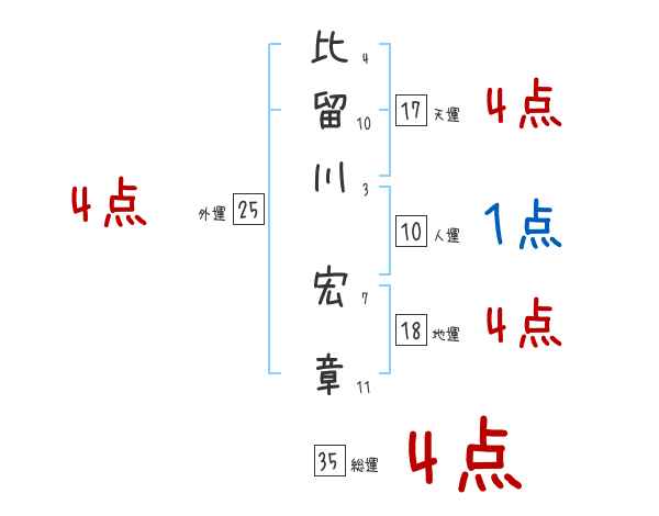 人運![]() | 比留川宏章さんの人運は10画の1つ星!不安を感じやすい傾向。ストレスを抱えないように注意しましょう。 性格や才能などを表す2番目に重要な運勢です。人間関係や協調性、社会的な成功に影響します。主に20歳から50歳ぐらいまでの中年期の運勢を表します。 |