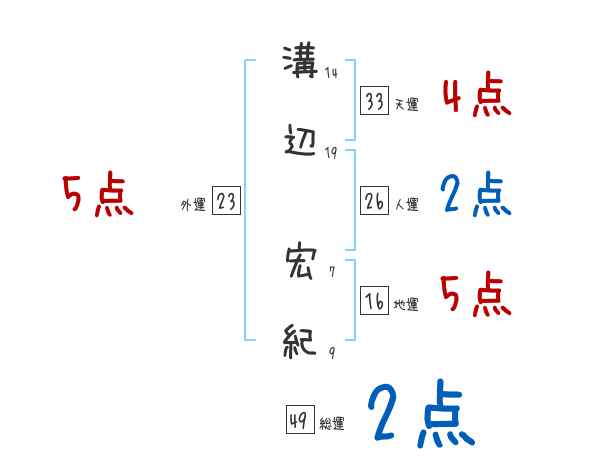 外運![]() | 溝辺宏紀さんの外運は23画の5つ星!想像力に優れ活力がある。一代で成功し名誉を手に入れる。 生活面を象徴する運勢です。外部から受ける影響力を表し、結婚運、家庭運や職場、環境への順応性を表します。 |