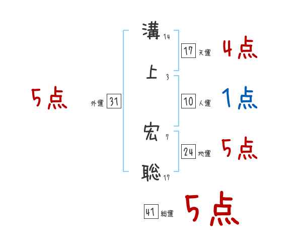 外運![]() | 溝上宏聡さんの外運は31画の5つ星!社交性があり判断力に優れる。順風満帆な人生で円満な生活。 生活面を象徴する運勢です。外部から受ける影響力を表し、結婚運、家庭運や職場、環境への順応性を表します。 |