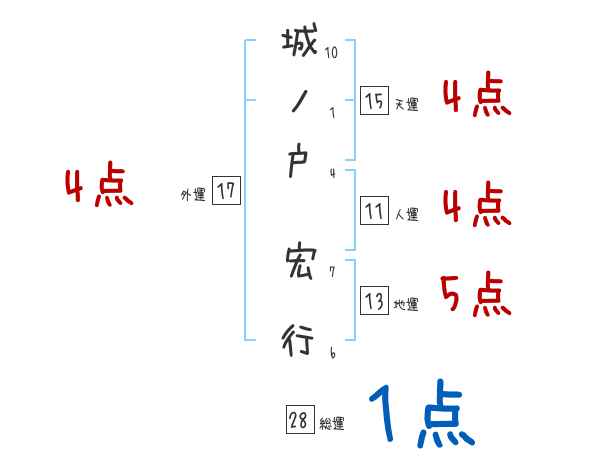 外運![]() | 城ノ戸宏行さんの外運は17画の4つ星!積極的な行動力。地位を気づき財産を手に入れる。純粋な心と直感力。 生活面を象徴する運勢です。外部から受ける影響力を表し、結婚運、家庭運や職場、環境への順応性を表します。 |