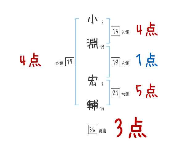 天運![]() | 小淵宏輔さんの天運は15画の4つ星!人徳があり出世する。順調に物事を進め円満な人生。 家系が持つ宿命的な運勢を表します。祖先から受け継いだ苗字ですので自分の力が及びません。家柄を象徴します。 |
