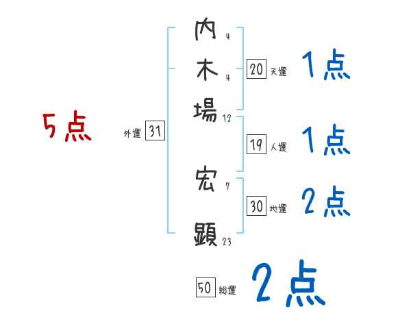 総運![]() | 内木場宏顕さんの総運は50画の2つ星!浮き沈みが激しく不安定。しりすぼみに衰退しやすいので注意しましょう。 あなたの人生を表す1番重要な運勢です。生涯を通じて影響する総合運となり、主に50歳以降の晩年期に影響を及ぼします。 |