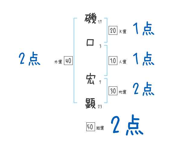 人運![]() | 磯口宏顕さんの人運は10画の1つ星!不安を感じやすい傾向。ストレスを抱えないように注意しましょう。 性格や才能などを表す2番目に重要な運勢です。人間関係や協調性、社会的な成功に影響します。主に20歳から50歳ぐらいまでの中年期の運勢を表します。 |