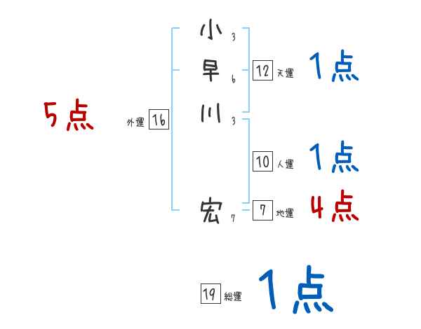 外運![]() | 小早川宏さんの外運は16画の5つ星!人望が厚く大きく発展する。逆転成功が見える。 生活面を象徴する運勢です。外部から受ける影響力を表し、結婚運、家庭運や職場、環境への順応性を表します。 |
