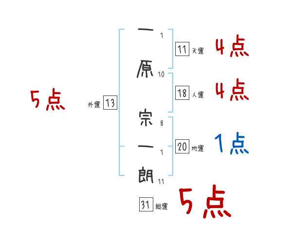 外運![]() | 一原宗一朗さんの外運は13画の5つ星!才能に恵まれ人気がある。名声を手に入れる。円満な人生。 生活面を象徴する運勢です。外部から受ける影響力を表し、結婚運、家庭運や職場、環境への順応性を表します。 |