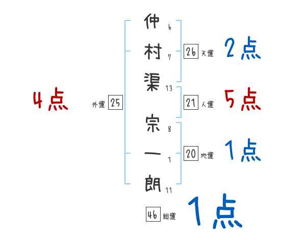 天運![]() | 仲村渠宗一朗さんの天運は26画の2つ星!波瀾万丈かも。信頼できる人を大事にしましょう。 家系が持つ宿命的な運勢を表します。祖先から受け継いだ苗字ですので自分の力が及びません。家柄を象徴します。 |