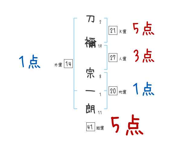 天運![]() | 刀禰宗一朗さんの天運は21画の5つ星!統率力がある。独立し成功する。名誉を手に入れる。 家系が持つ宿命的な運勢を表します。祖先から受け継いだ苗字ですので自分の力が及びません。家柄を象徴します。 |