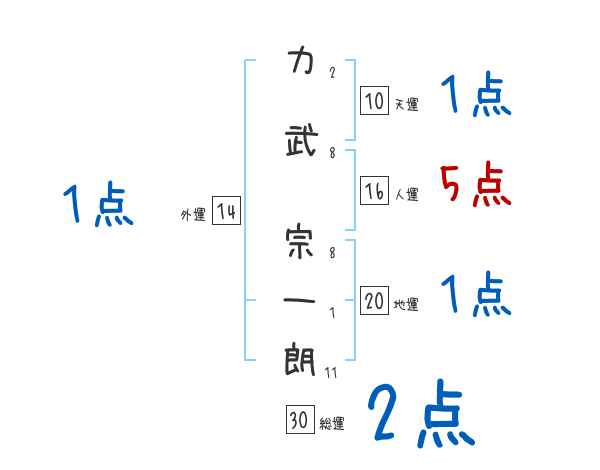 天運![]() | 力武宗一朗さんの天運は10画の1つ星!不安を感じやすい傾向。ストレスを抱えないように注意しましょう。 家系が持つ宿命的な運勢を表します。祖先から受け継いだ苗字ですので自分の力が及びません。家柄を象徴します。 |