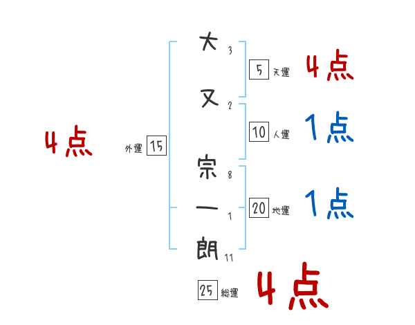 天運![]() | 大又宗一朗さんの天運は5画の4つ星!健康で安泰。協調性に優れ、財産に恵まれる。 家系が持つ宿命的な運勢を表します。祖先から受け継いだ苗字ですので自分の力が及びません。家柄を象徴します。 |