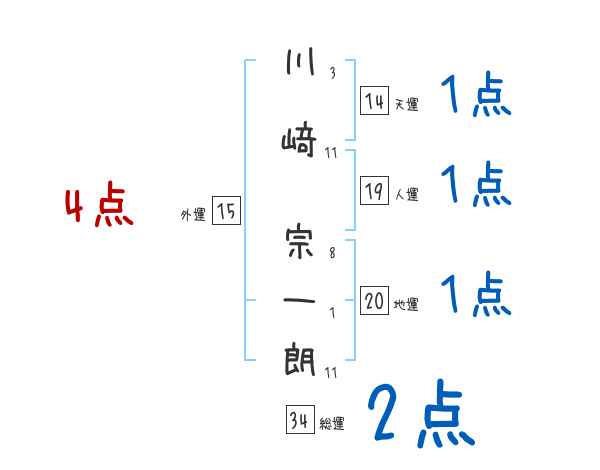 総運![]() | 川﨑宗一朗さんの総運は34画の2つ星!独創性に優れるが、自尊心が強く災難に注意しましょう。 あなたの人生を表す1番重要な運勢です。生涯を通じて影響する総合運となり、主に50歳以降の晩年期に影響を及ぼします。 |