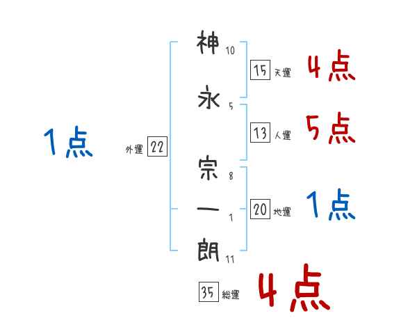 総運![]() | 神永宗一朗さんの総運は35画の4つ星!温厚な性格で感受性が高い。穏和な性格で人望が厚い。 あなたの人生を表す1番重要な運勢です。生涯を通じて影響する総合運となり、主に50歳以降の晩年期に影響を及ぼします。 |