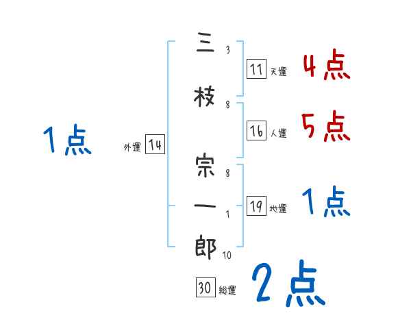 天運![]() | 三枝宗一郎さんの天運は11画の4つ星!着実に富や地位を得る幸運な人生。 家系が持つ宿命的な運勢を表します。祖先から受け継いだ苗字ですので自分の力が及びません。家柄を象徴します。 |