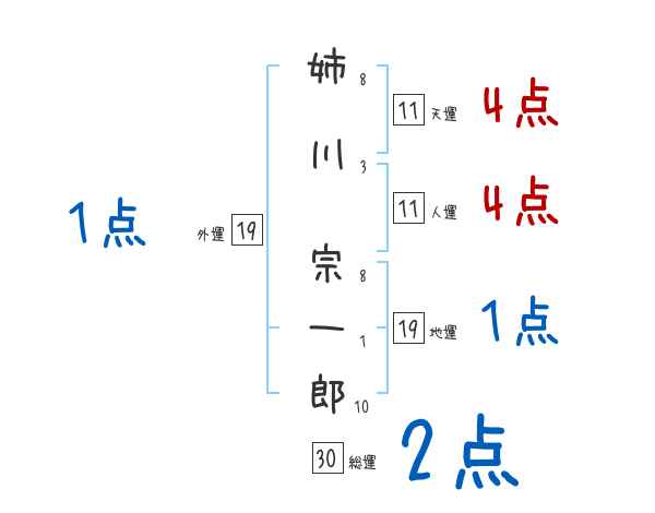 天運![]() | 姉川宗一郎さんの天運は11画の4つ星!着実に富や地位を得る幸運な人生。 家系が持つ宿命的な運勢を表します。祖先から受け継いだ苗字ですので自分の力が及びません。家柄を象徴します。 |