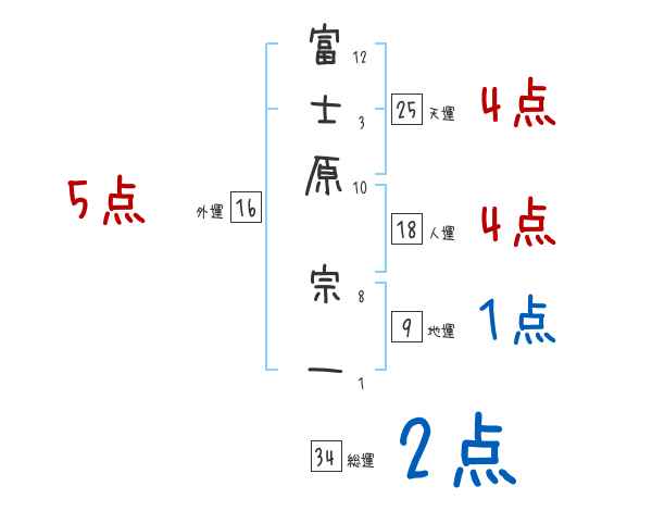 外運![]() | 富士原宗一さんの外運は16画の5つ星!人望が厚く大きく発展する。逆転成功が見える。 生活面を象徴する運勢です。外部から受ける影響力を表し、結婚運、家庭運や職場、環境への順応性を表します。 |