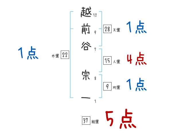 天運![]() | 越前谷宗一さんの天運は28画の1つ星!家庭環境に注意。スポーツで活躍できる能力があるかも。 家系が持つ宿命的な運勢を表します。祖先から受け継いだ苗字ですので自分の力が及びません。家柄を象徴します。 |