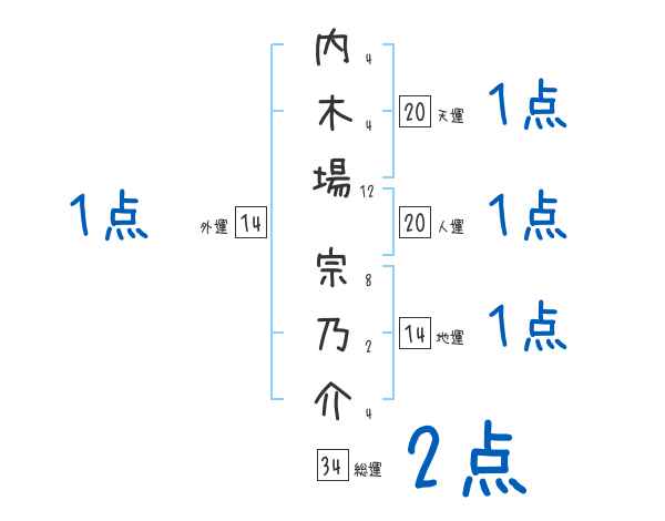 総運![]() | 内木場宗乃介さんの総運は34画の2つ星!独創性に優れるが、自尊心が強く災難に注意しましょう。 あなたの人生を表す1番重要な運勢です。生涯を通じて影響する総合運となり、主に50歳以降の晩年期に影響を及ぼします。 |