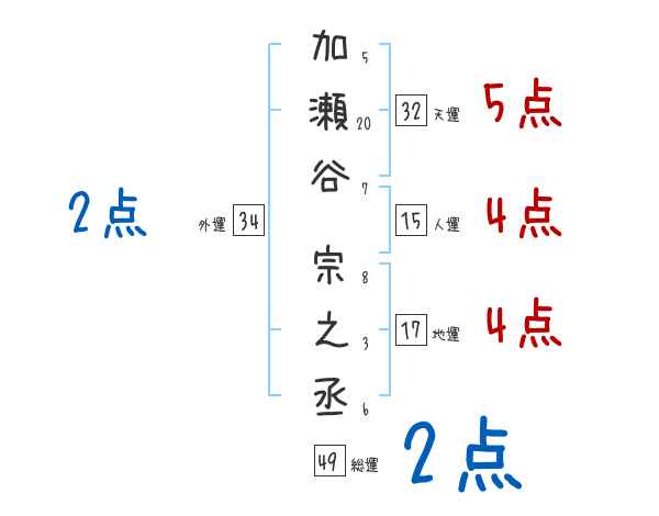 総運![]() | 加瀬谷宗之丞さんの総運は49画の2つ星!不安定な性格で明暗がある人生。周りの人には支援されやすい。 あなたの人生を表す1番重要な運勢です。生涯を通じて影響する総合運となり、主に50歳以降の晩年期に影響を及ぼします。 |