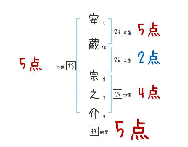 総運![]() | 安蔵宗之介さんの総運は39画の5つ星!社交性に優れ人望が厚い。人の上に立ち成功する。 あなたの人生を表す1番重要な運勢です。生涯を通じて影響する総合運となり、主に50歳以降の晩年期に影響を及ぼします。 |