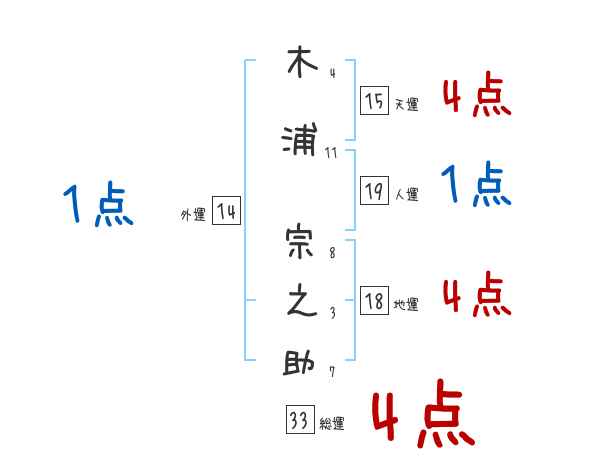 総運![]() | 木浦宗之助さんの総運は33画の4つ星!権力志向でプライドが高い。勇気があり運を切り開き成功する。 あなたの人生を表す1番重要な運勢です。生涯を通じて影響する総合運となり、主に50歳以降の晩年期に影響を及ぼします。 |