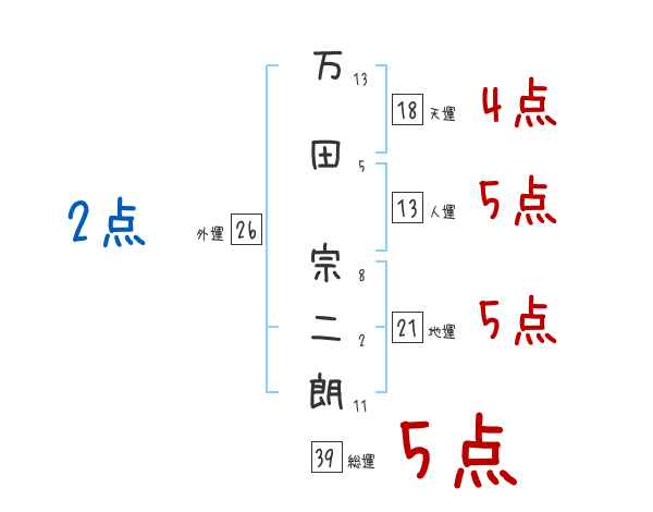 総運![]() | 万田宗二朗さんの総運は39画の5つ星!社交性に優れ人望が厚い。人の上に立ち成功する。 あなたの人生を表す1番重要な運勢です。生涯を通じて影響する総合運となり、主に50歳以降の晩年期に影響を及ぼします。 |