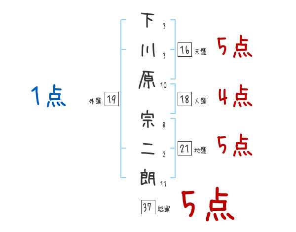 外運![]() | 下川原宗二朗さんの外運は19画の1つ星!優れた才能を持ちますが、協調性が足りないことも。周りの人と協力する事を意識しましょう。 生活面を象徴する運勢です。外部から受ける影響力を表し、結婚運、家庭運や職場、環境への順応性を表します。 |