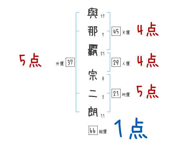天運![]() | 與那覇宗二朗さんの天運は45画の4つ星!もくもくと物事を進め達成する。地味な努力家。 家系が持つ宿命的な運勢を表します。祖先から受け継いだ苗字ですので自分の力が及びません。家柄を象徴します。 |