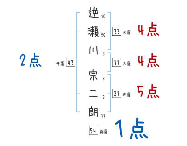 外運![]() | 逆瀬川宗二朗さんの外運は43画の2つ星!頑固な性格で独立心が強いかも。やや非現実的で浪費に注意しましょう。 生活面を象徴する運勢です。外部から受ける影響力を表し、結婚運、家庭運や職場、環境への順応性を表します。 |