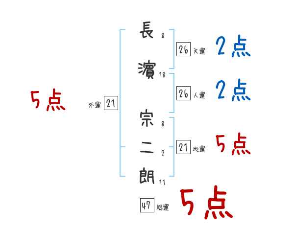 総運![]() | 長濵宗二朗さんの総運は47画の5つ星!実力が開花し発展する円満な人生。財に恵まれる。 あなたの人生を表す1番重要な運勢です。生涯を通じて影響する総合運となり、主に50歳以降の晩年期に影響を及ぼします。 |